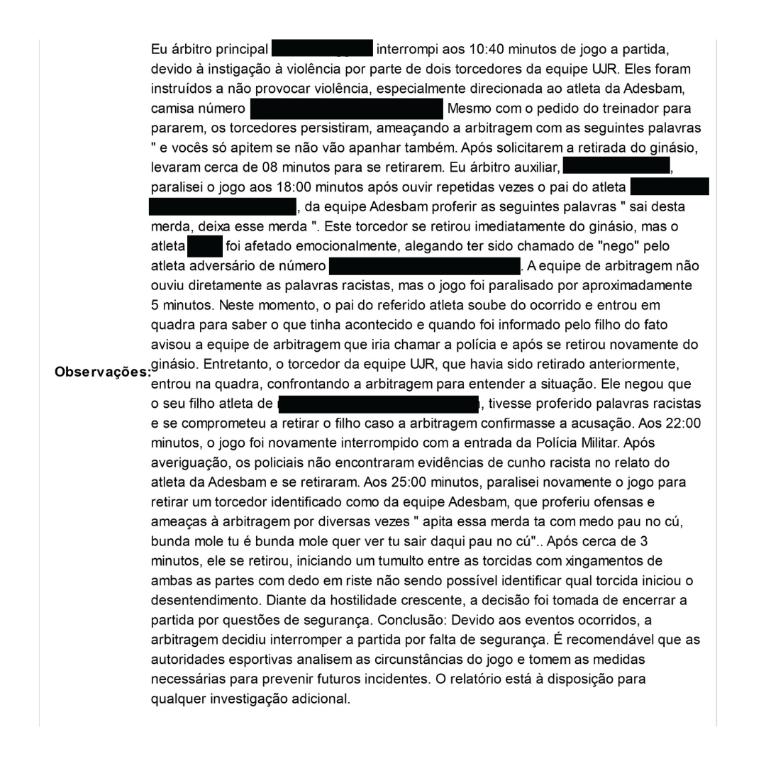 Diante destes distorcidos fatos, a UJR informa que a Brigada Militar foi acionada e compareceu ao local. Após averiguação 𝐍𝐀̃𝐎 𝐂𝐎𝐍𝐒𝐓𝐀𝐓𝐎𝐔 𝐍𝐄𝐍𝐇𝐔𝐌𝐀 𝐄𝐕𝐈𝐃𝐄̂𝐍𝐂𝐈𝐀 𝐃𝐄 𝐂𝐔𝐍𝐇𝐎 𝐑𝐀𝐂𝐈𝐒𝐓𝐀 que teria sido proferida por um de nossos atletas, conforme relato da súmula de jogo (foto abaixo).